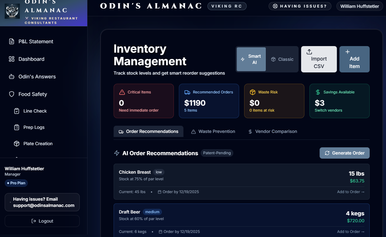 Odin's Almanac is the AI-powered restaurant operations platform that unifies food safety, financial intelligence, and predictive ordering — saving the average restaurant $3,500 per month.